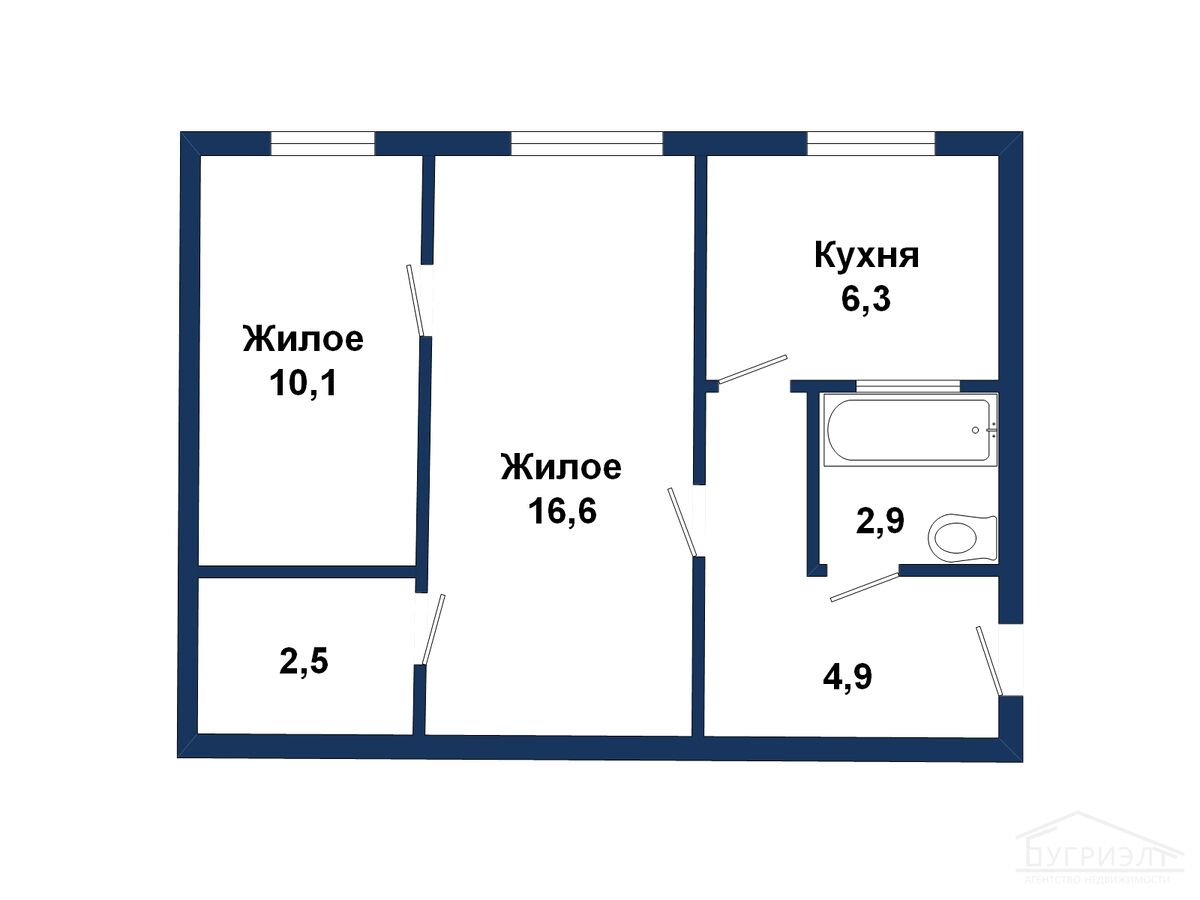 Общая площадь 43,3 м2, жилая 26,7 м2 ,кухня 6,3 м2, санузел совмещенный.