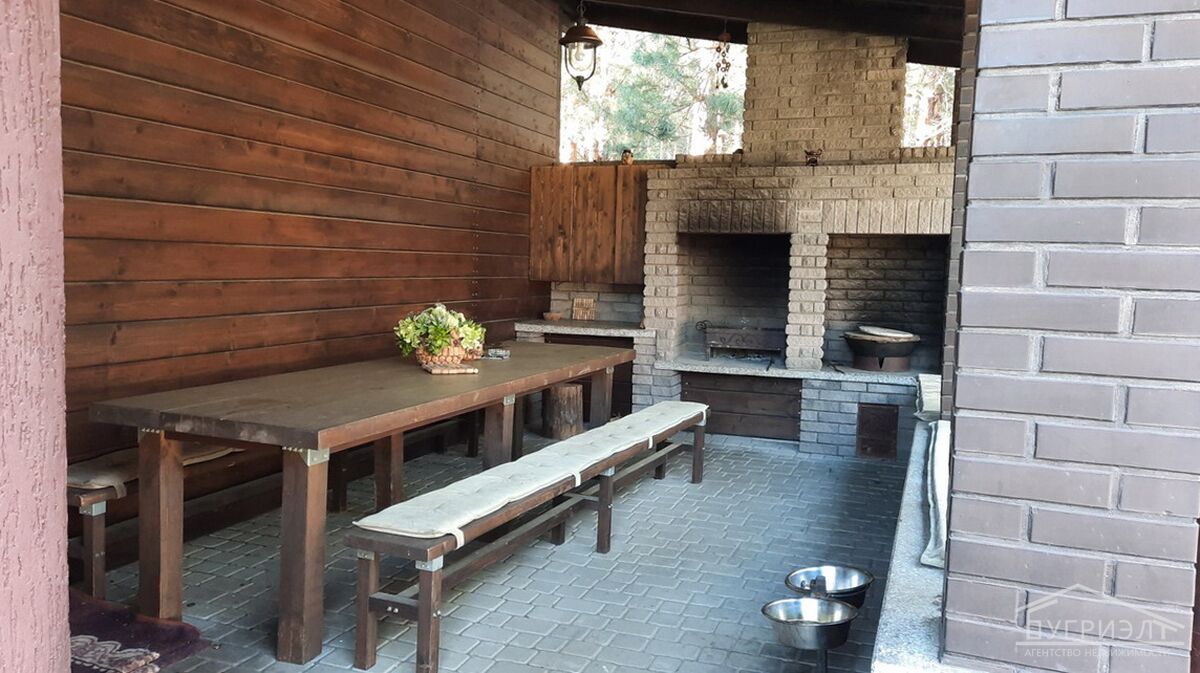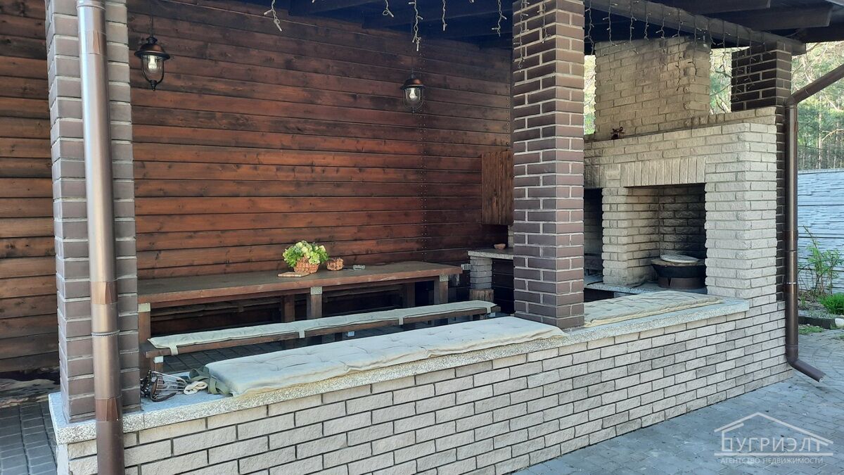 Под навесом оборудована уютная терраса с зоной барбекю, есть дровник и небольшой сарай.