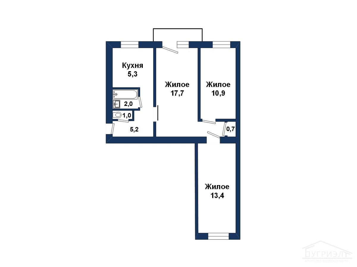 Общая площадь - 56,2 м2, жилая - 42,0, просторная кухня-гостиная. Санузел совмещенный.