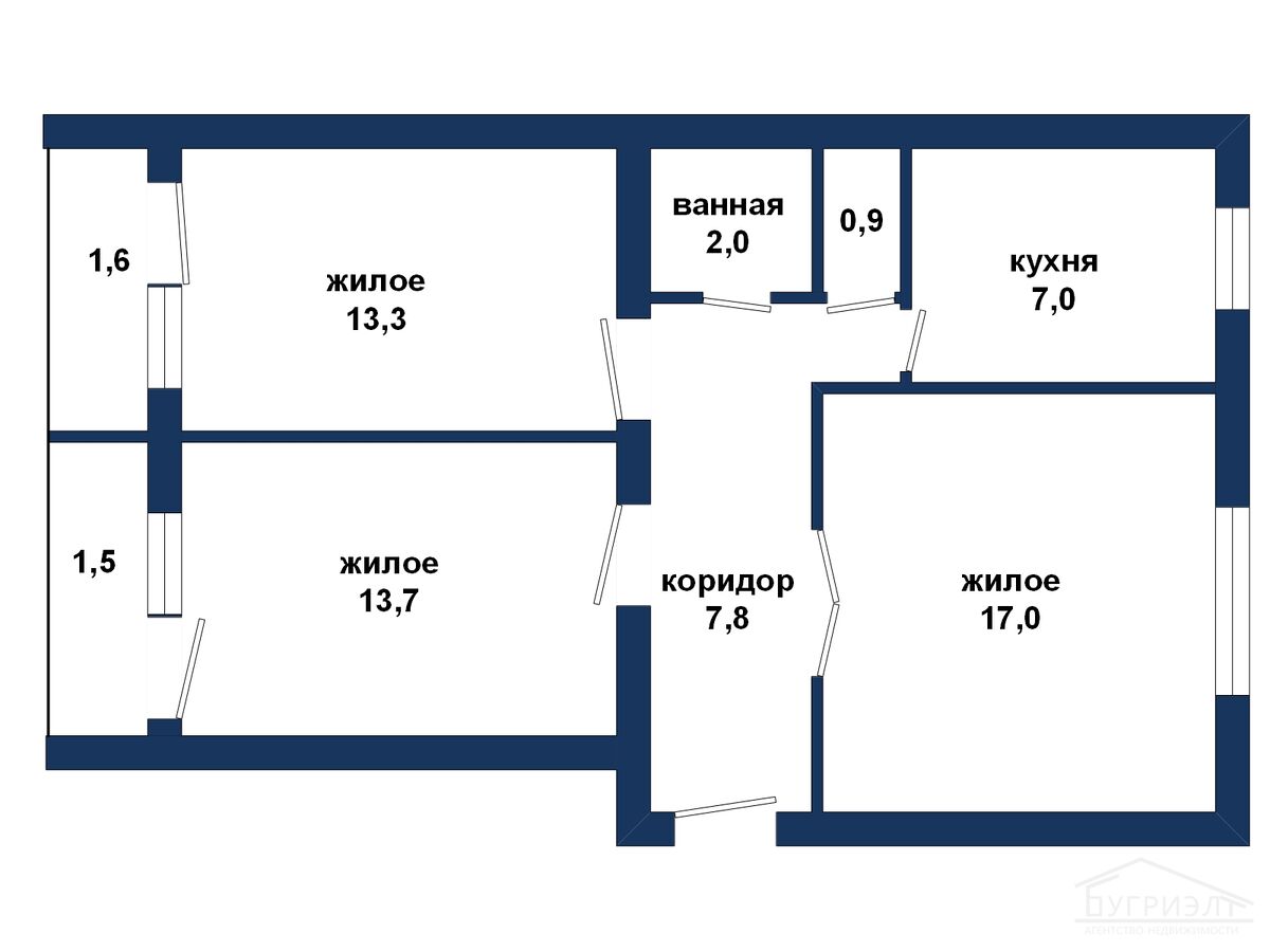 Функциональная планировка: светлая гостиная - 17 м2, жилая комната - 13,1 м2, жилая комната - 13,3 м2, кухня - 7 м2, туалет - 0,9 м2, ванная комната - 2 м2, две застекленные лоджии с выходом из жилых комнат (1,5 м2 и 1,6 м2), широкий коридор - 7,8 м2. Высота потолков - 2,85 метра.