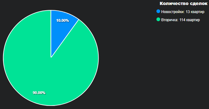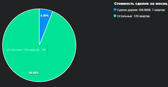 Что касается сделок с дорогими квартирами, то тут четвертый месяц подряд отмечаем рекордное количество продаж с высокими ценами. По итогам месяца 7 квартир или 6% рынка января превысили цену в 100.000 долларов.